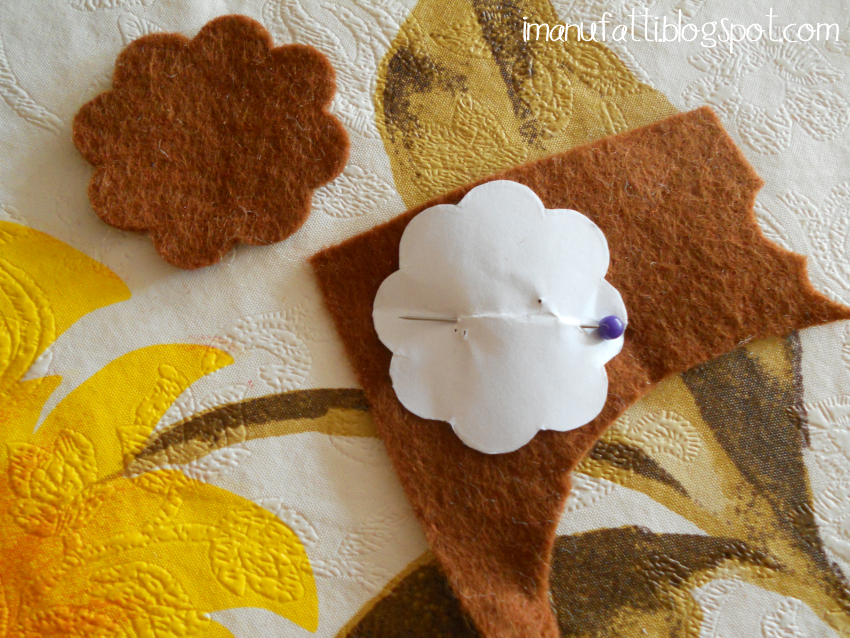 2. Ritagliate le sagome di carta e fissatele al feltro con gli spilli, quindi ritagliate un fiore centrale (marrone) e un fiore-base (rosso).