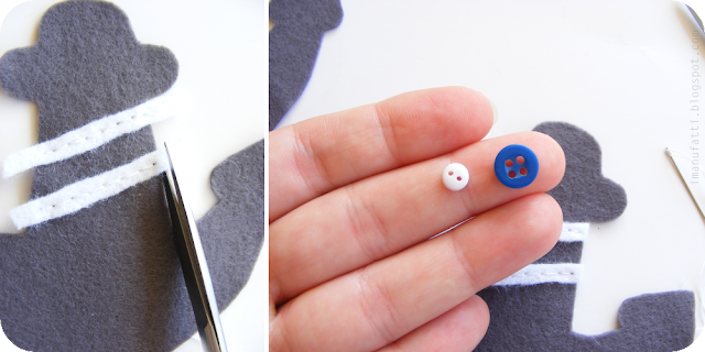 2. Trim off the stripes' excess. Take the two buttons and sew them on the anchor. With the hemp twine, make a loop and sew it on the second anchor template. Sew the loop with just a few superficial stitches, without going all the way through the felt. (Stitches must be invisible on the back of the anchor).