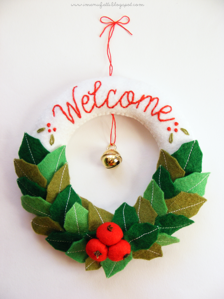 Start by printing the templates at the bottom of this post, and just as for the autumn wreath pin the template on a piece a white felt, trace the inner circle with a pencil and cut it out. Follow the autumn wreath's instructions to embroider the Welcome writing using baking paper technique, one one of the two wreath piece, in red embroidery thread using back stitch. Make three red French knots and two leaves using lazy daisy stitch, at both ends of the writing. Start sewing the inner circle first using blanket stitch and stuff the wreath as you go on sewing the outer edge.
